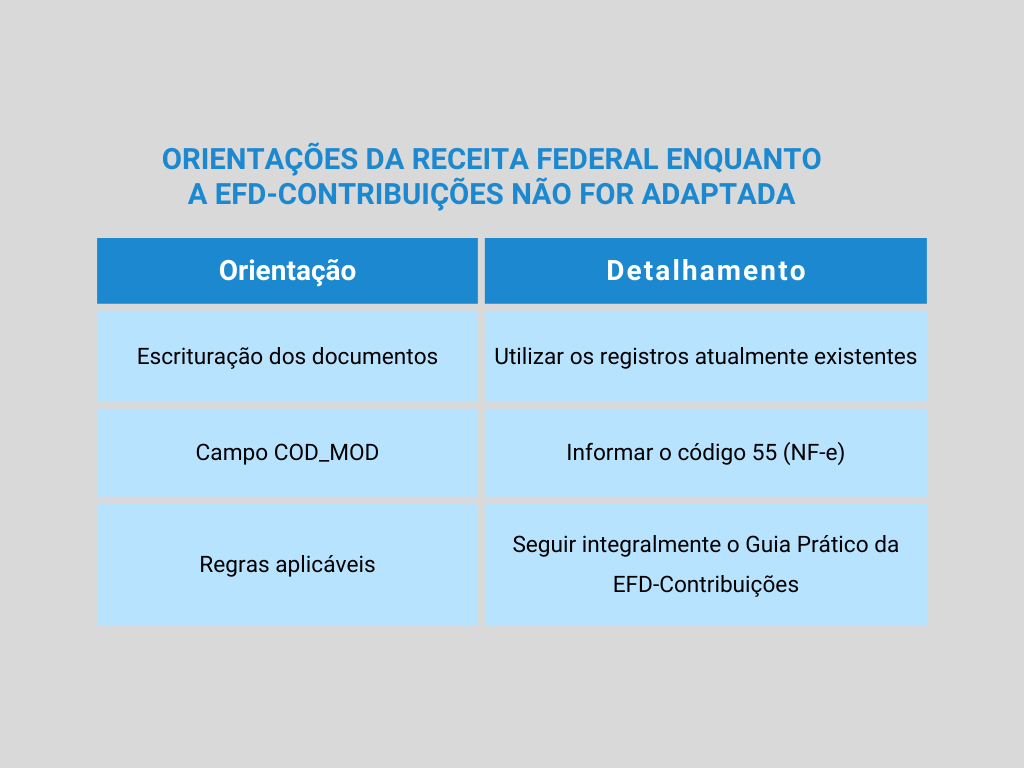 Enquanto a EFD-Contribuições não for tecnicamente adaptada para recepcionar esses novos modelos, a Receita Federal orienta que:
