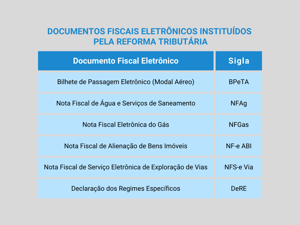 No contexto da Reforma Tributária, foram instituídos novos documentos fiscais eletrônicos, entre eles: